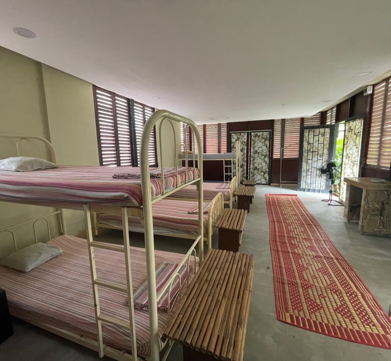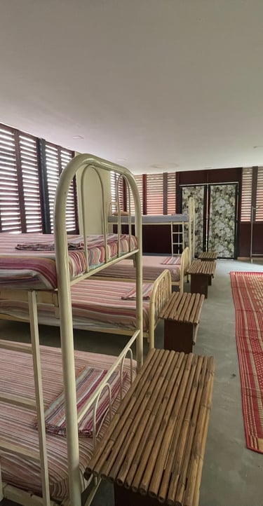 Dortoir de 6 lits, non mixte, confortable entourée de verdure, calme. L'utilisation des telephones est interdit dans le dortoir.